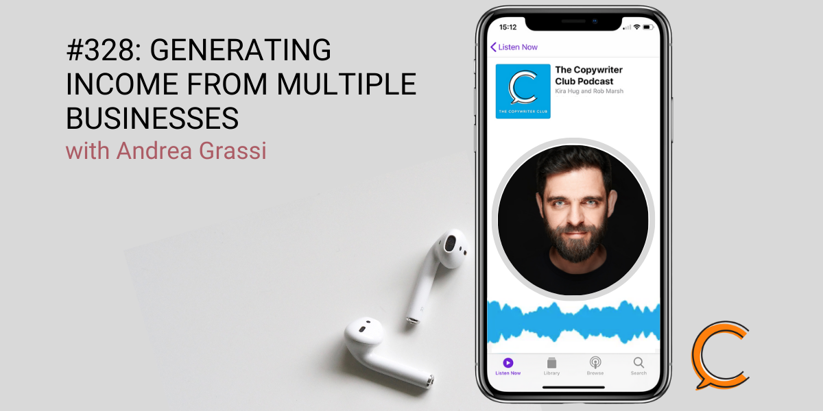 Andrea Grassi is our guest on the 328th episode of The Copywriter Club Podcast. Andrea is a serial entrepreneur with 6 businesses, and he shares how he’s able to manage, build, and grow each business. If you’ve ever thought about expanding your sources of income, you’ll want to tune into this episode.